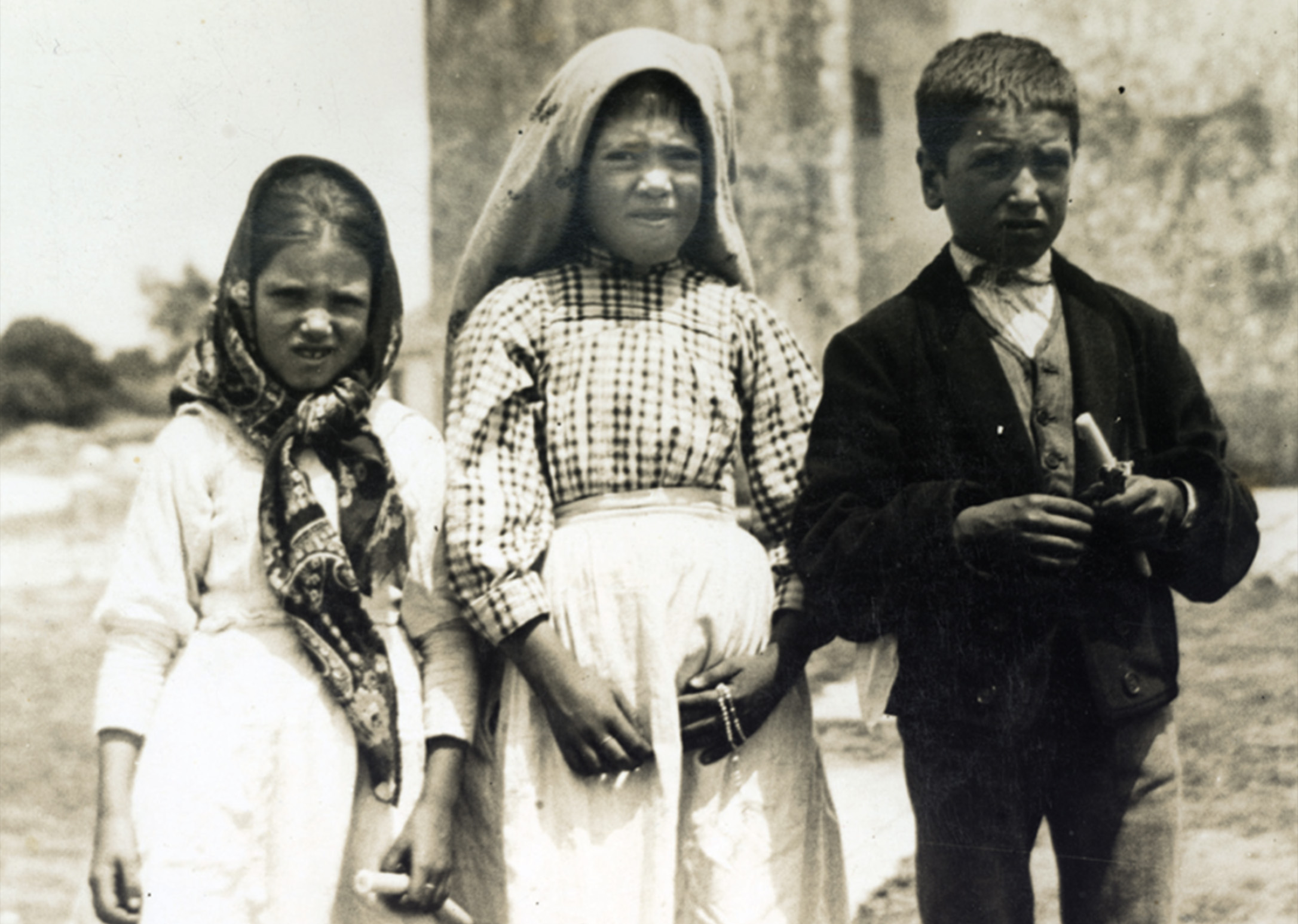 Fotografia dos três videntes, Jacinta, Lúcia e Francisco, perto da igreja paroquial de Fátima, junto ao cruzeiro. Mário Godinho, 1917.07.13 (Arquivo do Santuário de Fátima – Núcleo Audiovisual)